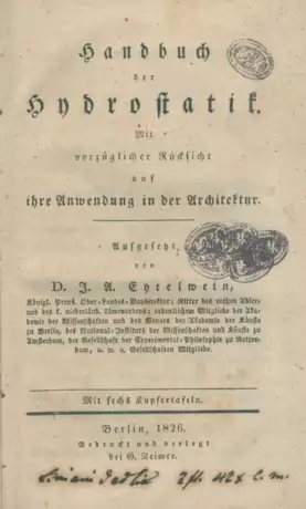 Poggendorff I, 708 - ADB VI, 464. Erste Ausgabe. - J.A.Eytelwein (1764-1848) war der bedeutendste deutsche Wasserbauingenieur seiner Zeit. - Titel gestempelt u. mit hs. Besitzvermerk, leicht gebräunt od. etw. braunfleckig, Tafeln tls. fleckig od. mit Faltungseinrissen, Ebd. etw. berieben od. fleckig.