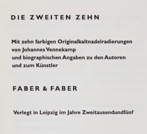 Die Graphischen Bücher. - Erstlingswerke deutscher Autoren des 20. Jahrhunderts, Supplement. Gesamtgestaltung Jürgen Seuss. - Eines v. 204 Ex. Alle Graphiken sind von den Künstlern eh. sign. - ╔Dabei: Vennekamp,J.╗ Die zweiten Zehn. Ebda. 2005. Mit 10 Kaltnadelrad. v. J.Vennekamp. Olwd.-Kassette. Eines v. 200 Ex. (GA 210). Alle Radierungen vom Künstler num. und sign.