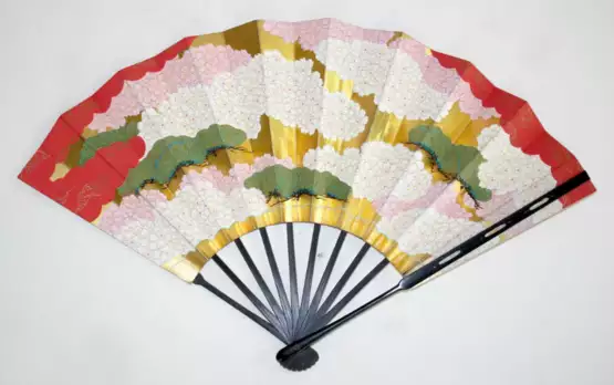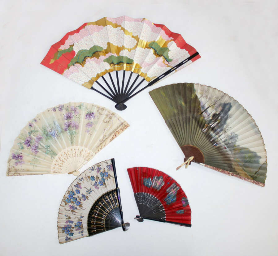 Konvolut von 5 Fächern, davon 1 Fächer im Prunkrahmen, und Orig,-Schachtel. Mit Blumendekor. - Wohl Anfang 20. Jhdt.
