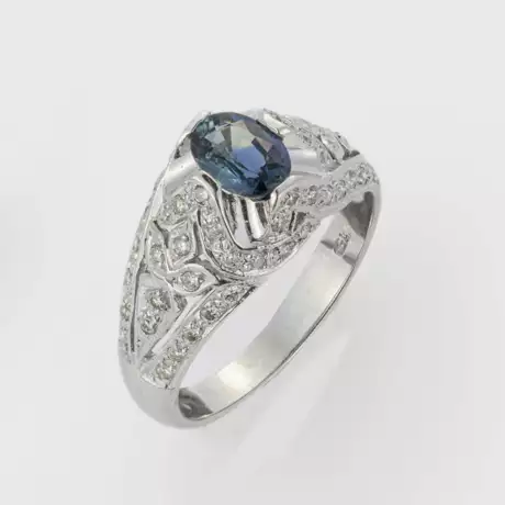 Weißgold, gest. 750. Zentral besetzt mit indigoblauem Saphir von ca. 0,50 ct., ausgefasst mit Diamanten von zus. ca. 0,90 ct.; Gew. ca. 5,80 g.
