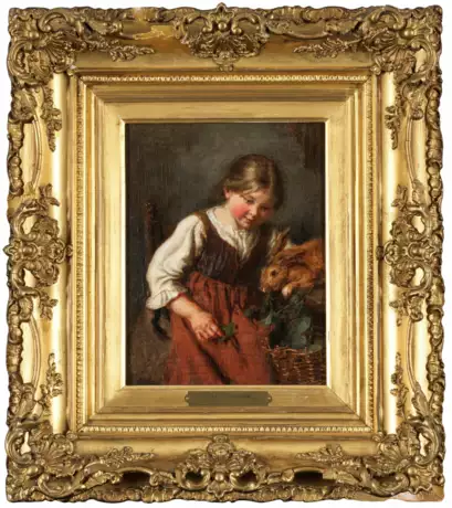 Charakteristisches Werk aus der Welt der Kinder, die Schlesinger meisterhaft und einfühlsam zu schildern verstand. Wie oft in seinen Bildern zu sehen, geht es auch hier um den spielerischen und umsorgenden Umgang mit kleinen Tieren, meistens Kaninchen. Schlesinger studierte an der Düsseldorfer Akademie bei Rudolf Jordan, bevor er sich um 1862/63 in München niederließ. Öl/Holztafel. L. o. sign.; Verso altes englisches Galerieetikett mit Künstlerbez. und Bildtitel. 24 cm x 18,5 cm. Rahmen.
