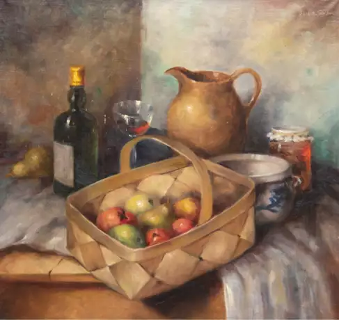 Лот 123 | Fischer, Carl Holger (1898-1955) "Stilleben mit Obstkorb, Krug und Weinflasche", Öl/ Lw., sign. o.r., min. Farbverluste, 68x68 cm, Rahmen