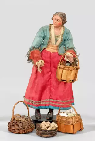 Neapolitan crib figure of a young fisherman’s wife offering baskets of seafood. Painted terracotta, glass eyes, embroidered silk fabric, bast, shells, wax. Minor signs of age and use.