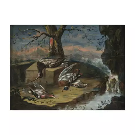 Hunting still life with shot birds in a landscape