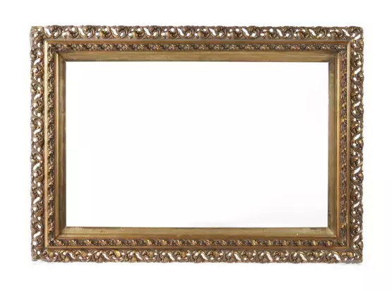 um 1900, gestuckt und goldbronziert, ca. 14 cm breiter, durchbrochen gearbeiteter Rahmen, das Inlay blattvergoldet, Altersspuren, Falzmaße 97 x 60 cm.