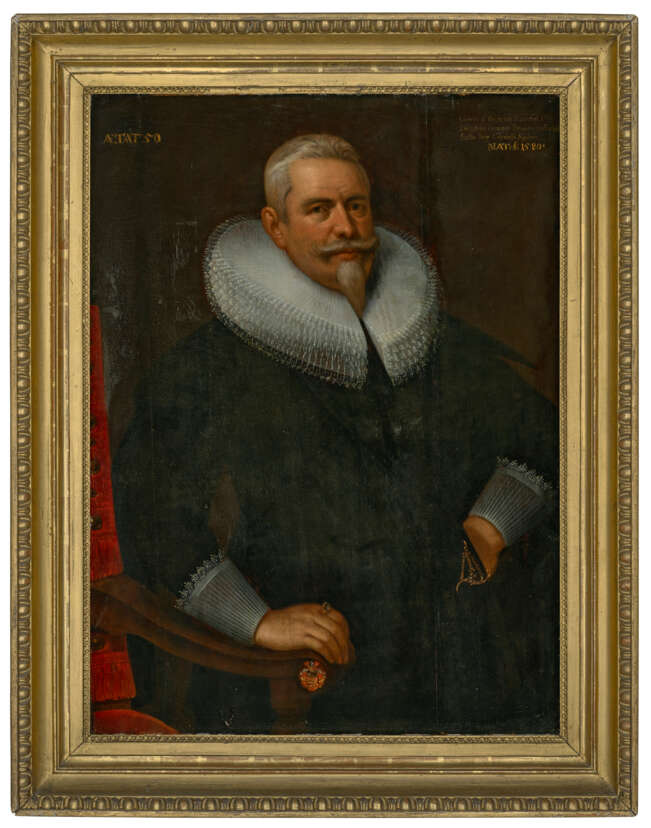 Portrait of Gabriel de Bruyn van Blankenforst (?1580-1654), three-quarter-length, in a black coat and cartwheel ruff