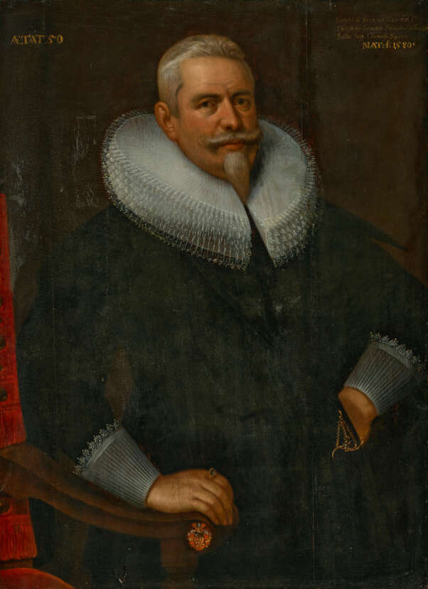 inscribed 'ÆTAT:50' (upper left) and 'Gabriel de Brüyn von Blanckefort IV / Diüerforüm Germania Principüm Confibanus / fuclite Reip. Coloniensis Sÿndicüs / NAT: A: 1580' (upper right); and with the coat of arms of the De Bruyn van Blankenforst family (lower centre)