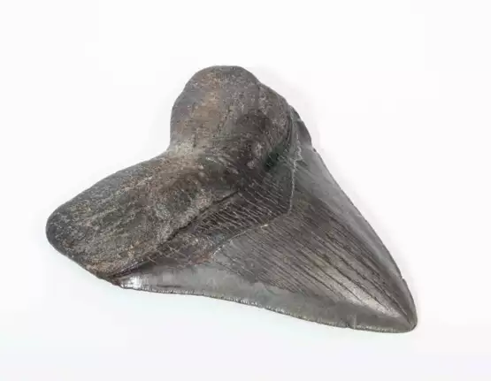 (OTODUS/CARCHAROCLES MEGALODON). Grauer Zahn in schöner Erhaltung. 9,5x11,5 cm.