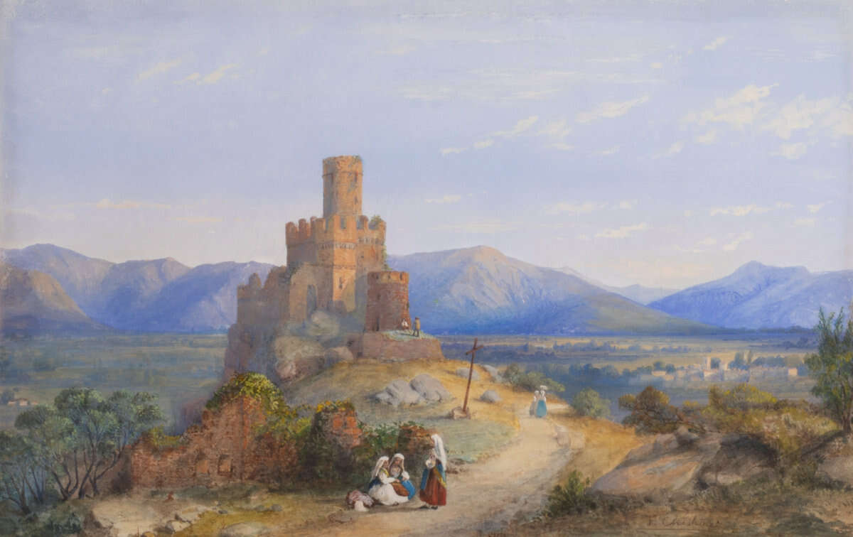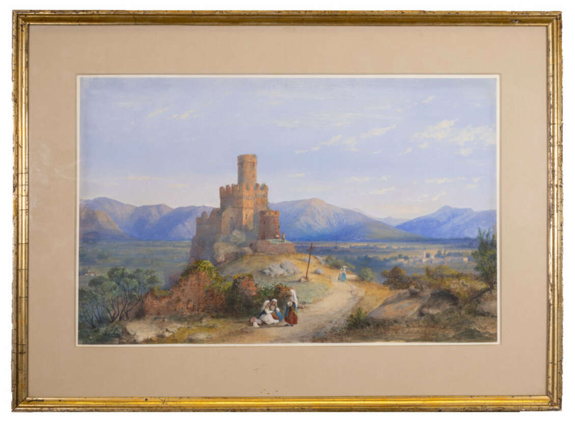 Ruined castle with figures, watercolour on paper, 29.5 × 45.5 cm, signed, mounted