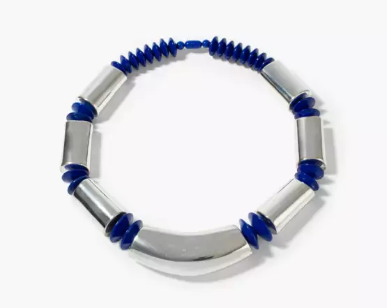 1980er. Aus blauem und weissmetallfarbenem Galalith. Runde und zyliderförmige Glieder. L 58 cm.