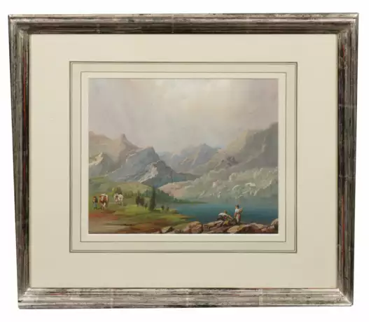 Atmosphärische, romantisch aufgefasste Landpartie an einem klaren Gebirgssee, belebt durch einen Rinderhirten mit seinem Vieh und zwei Fischern beim Einholen ihrer Netze. Charakteristische, stimmungsgeladene Arbeit des bömischen Künstlers Duchoslav, der bei Josef Matej Navrátil und Karel Nacovský lernte. Gouache/Papier. R. u. sign. in Rot. 20,3 cm x 23,6 cm (Passepartoutausschnitt). Rahmen.