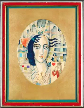 Für den Künstler typisches Frauenbildnis im Art-déco-Stil, von einem abstrakt-konstruktivistischen Hintergrund, der hier eine Art Strahlenkranz bildet, hinterfangen. Die "Herz Dame" tritt dabei in Beziehung zu einer gezeichneten Spielkarte mit Herz König. Sedivy, dessen gleichnamiger Vater ebenfalls Maler war, war ein sehr vielseitiger Künstler. Er erhielt eine Ausbildung an der Technischen Schule in Frederiksberg, gefolgt von der Kopenhagener Kunstschule und der Dänischen Handwerksschule. Zunächst war er als Dekorateur im Theater und Restaurator in verschiedenen Museen tätig. Gleichzeitig pflegte er sein Talent als Heraldiker und wurde 1945 Wappenmaler für die Königlichen Orden Dänemarks. Parallel entstanden Frauenbildnisse in seinem unverkennbaren modernistischen Stil. Mischtechnik und Collage/Papier. U. mittig sign. u. dat. 1963. Ovaler Passepartoutausschnitt 27 cm x 20 cm. Rahmen.