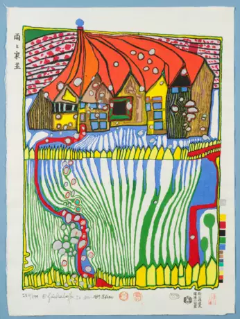 Farbholzschnitt/ Japanbütten, dat. 26. Nov(ember) (19)89 Wien. Typisches Motiv des Künstlers mit stilisierten, leuchtend bunten Häusern und Gärten im silbernen Schneefall. Handschriftlich sign., dat. u. nummeriert 254/499, Werknummer "557 B", mit japanischen Stempeln der Holzschneider und Drucker versehen. Hundertwasser heißt eigentlich Friedrich Stowasser, gab sich aber den klangvolleren Namen Friedensreich Regentag Dunkelbunt Hundertwasser. Er war nicht nur Maler, Zeichner, Graphiker und Plastiker, sondern betätigte sich auch als Architekt, Entwerfer, Philosoph und Umweltaktivist. Das hier vorgestellte Werk steht mit seinen 14 verschiedenen Farben in der Tradition des japanischen Holzschnitts. Der Entwurf stammte von Hundertwasser, aber ausgeführt wurde er von den zwei Japanern: Tatsuo Kawashima fertigte den Holzschnitt und Akio Shimizu druckte in Kyoto. Edition von Gruener Janura AG, Glarus/Schweiz. Seitenränder leicht wellig. Wvz. HWG 102. Blatt ca. 57 x 42 cm. Rahmen.