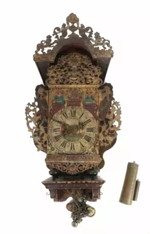 Лот 1236 | Friesische Stuhluhr 18./19. Jh., figürlich bemaltes Blechzifferblatt m…