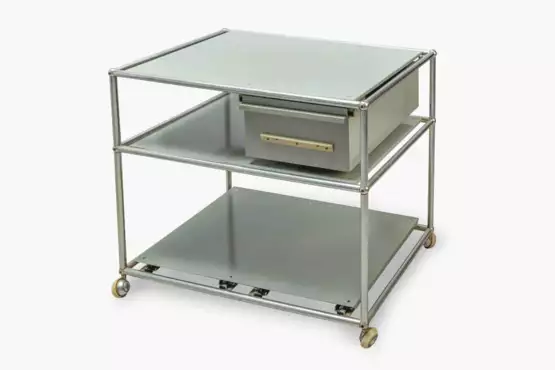 Entwurf 1963 für USM Haller, Münsingen. Metall, dunkelgrau lackiert bzw. verchromt. 57x51x67 cm.