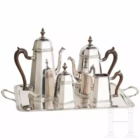 Silber. Bestehend aus Tablett, Kaffeekanne, Teekanne, Sahnegießer und Teedose. Holzhenkel und Handhaben. Alle Unterseiten mit Feingehalt "800", Nationalmarke sowie "LAVORAZIONE MANO". Tablett mit Kratzern. Holz mit Fehlstellen. Höhe Kannen 27 bzw. 23,5 cm, Länge Tablett 54 cm, Gesamtgewicht 3.700 g.