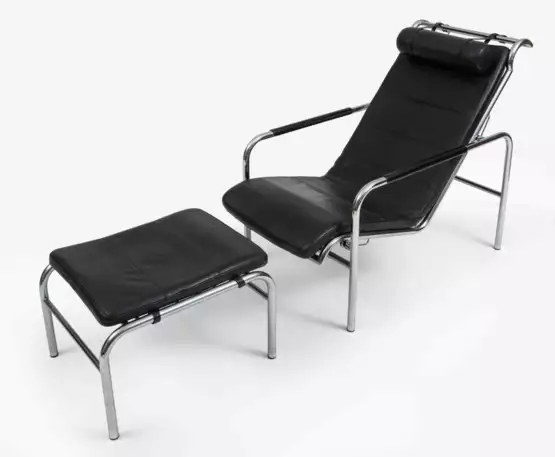 Entwurf 1938 für Zanotta, Mailand. Gestell aus verchromtem Stahlrohr. Gepolstert, schwarzer Lederbezug. Unbezeichnet. Sitzhöhe 29 cm (Sessel) bzw. 38 cm (Ottoman). 58x112x79 cm (Sessel) bzw. 55x115x38 cm (Ottoman).