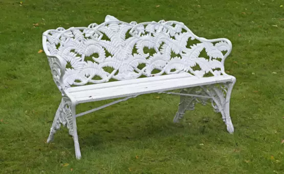 Metall und Holz, weiß lackiert. Geschwungener, durchbrochen gearbeiteter Korpus aus üppigen Farnblättern mit schlanken, vegetabil gestalteten Beinen. Sitzfläche aus schmalen, gekanteten Stegen. H. 88 cm. 147 cm x 50 cm. Sitz-H. 43 cm.