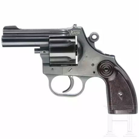 Kal. 9mmPAKnall, Nr. ohne, fünfschüssig. Dt. Beschuss. Links oben am Rahmen gemarkt "Korth", rechts Beschuss. Dunkle originale Brünierung, leichte Bestoßungen, Kimme mit Bearbeitungsspuren. Dunkelbraune Bakelitgriffschalen. Seltenes Sammlerstück aus den Anfängen der Fa. Korth, ca. 1955-60. Guter Zustand.