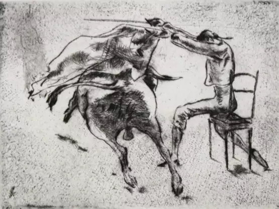 Aus der Folge von 31 Radierungen "Tauromachie". - Jwls. Ex. 39/100. - Ein Matador im Begriffe, den Stier im Sitzen zu töten, Übergeben der Banderillos, Ovation. - Äußere Ränder schmal lichtrandig.