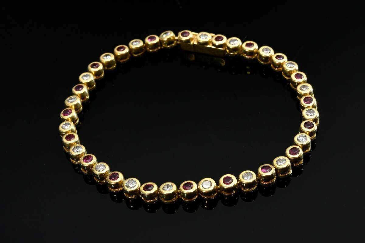 Лот 116 | Gelbgold 750 Tennisarmband mit Brillanten (zus. ca. 1.43ct/VSI/W) im Wechsel mit facettierten Rubinen (zus. ca. 1.05ct) in Zargenfassungen, 11,9g, L. 16,1cm
