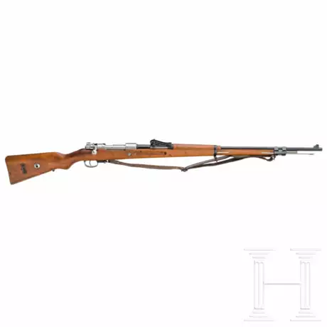 Cal. 8x57JS, SN. 1817d , nummerngleich bis auf Bajonettaufnahme. Fast blanker Lauf. Hülsenkopf gemarkt Krone / "Erfurt / 1916". Div. kaiserliche Abnahmen. Metallteile überarbeitet, Brünierung erneuert. Verschluss mit Hülse blank, ebenso die Beschläge. Buchenschaft, Kolben serienmässig gestückelt, mit EWB-Brandstempel, Putzstock, originaler Riemen und Mündungsschutz. Länge 125 cm.