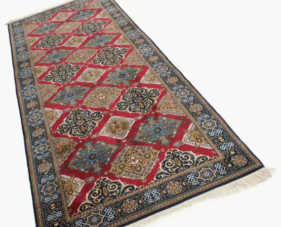 Z-Persien, um 1960. Das gesamte elegante rote Innenfeld ist durch filigrane, blütenbesetzte Rauten-Medaillons in diagonalen Reihen angelegt. 2 feingliedrige Nebenbordüren säumen die nachtblaue, mit Palmetten und Sternblüten verzierte Hauptbordüre. Sehr gute Erhaltung. 110x318 cm (ft. 3.6x10.5).