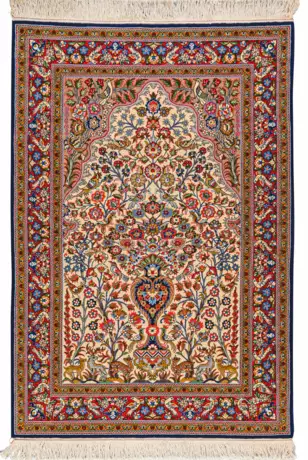Persien. Korkwolle auf Baumwolle. Im cremefarbenen Innenfeld passig geschweifte Nische mit großem Vasenmotiv sowie flächendeckende Musterung aus Blütenranken, Wildtieren und Vögeln. Umlaufend rotgrundige Bordüre aus Blüten und Vögeln. 109 cm x 162 cm.
