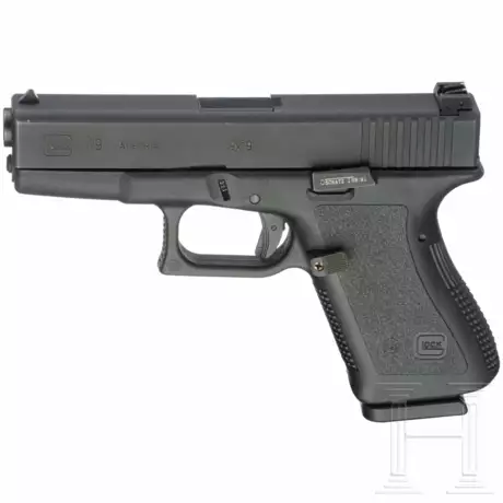Kal. 9mmLuger, Nr. BLB322, nummerngleich. Blanker Lauf, Länge 102 mm. 15-schüssig. Wiener Beschuss. 3-Punkt Visier Trilux H 3. Links am Verschluss Modell und Kaliber. Originale, matte Brünierung am Verschluss. Polymergriffstück. Magazin. Mit Wechselkimme und Korn, Ersatzschlagbolzen und drei Ersatzmagazinen. Alles in gutem Zustand.