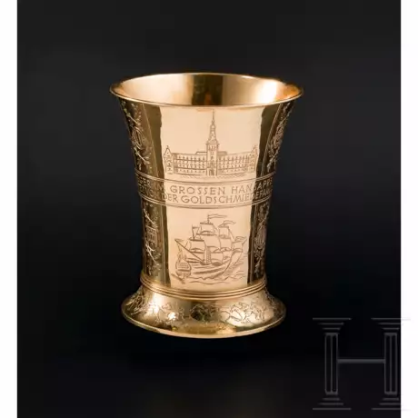 20ct. Gold. Auf rundem, ausgestelltem Fuß mit graviertem Pferderennen. Sich weitende Wandung, umlaufend mit zwölf gravierten Kartuschen, darunter Darstellung des Heiligen Eligius und Georg, den Drachentöter sowie mit Wappen des Hamburger Rennclubs, Hamburger Wappen, Wappen mit allsehendem Auge und Heiligem Geist. Mittig Widmungsinschrift "MASETTO DEM SIEGER IM GROSSEN HANSAPREIS 1956 GESTIFTET VON DER GOLDSCHMIEDEFAMILIE WILM". Unterseite punziert mit Feingehalt "20 KARAT", "H.J. Wilm Hamburg", Stadtmarke, Meistermarke. Höhe 10 cm, Gewicht 265,39 g.