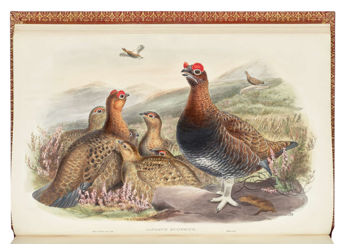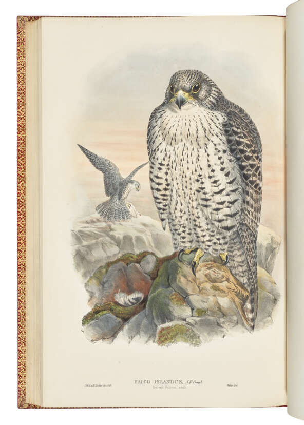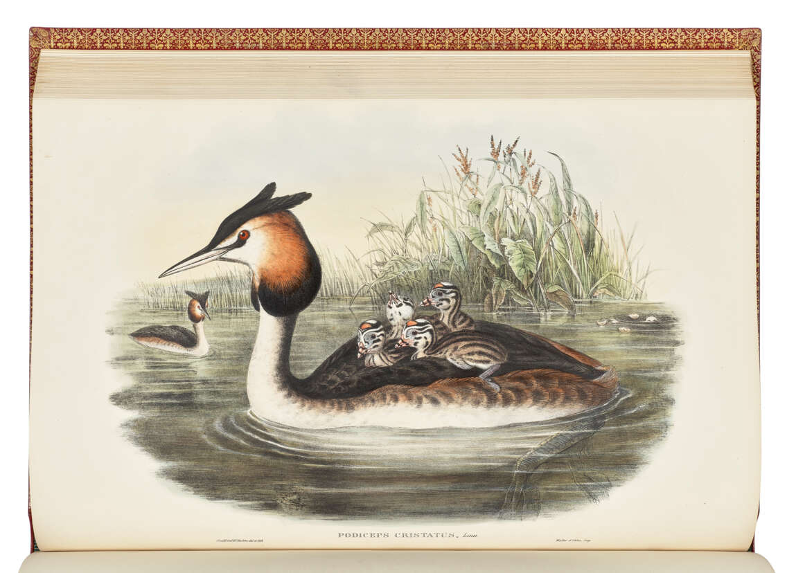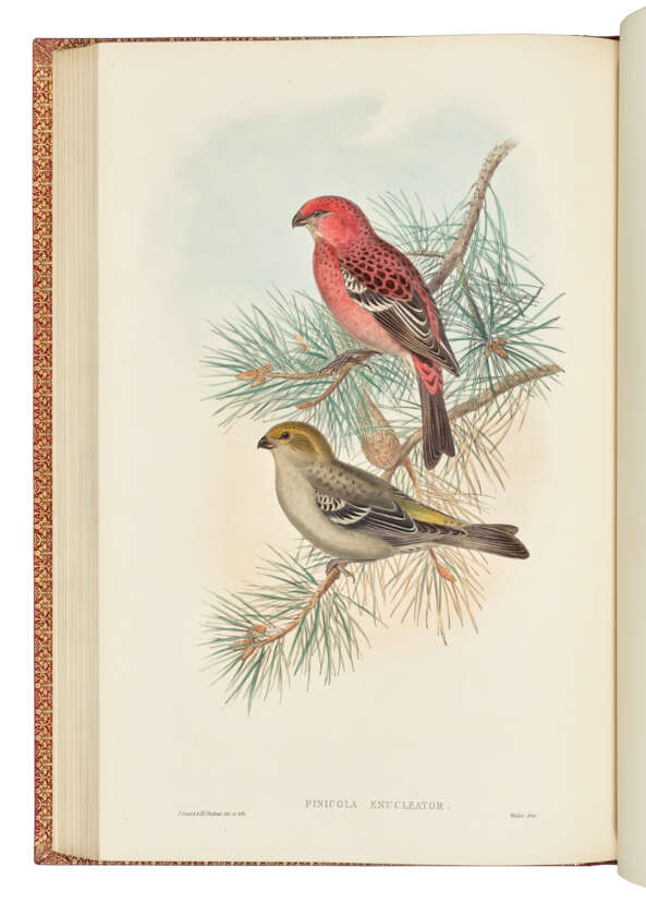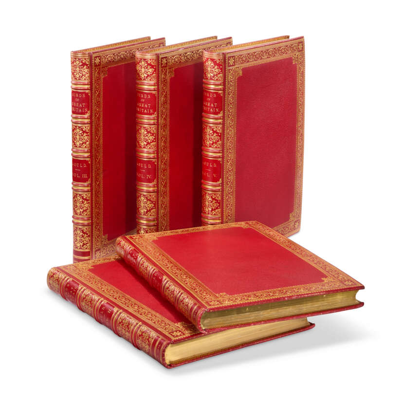 5 volumes, large folio (543 x 370mm). 367 fine hand-coloured lithographic plates, most heightened with gum-arabic, by Gould, Henry Constantine Richter, Joseph Wolf and William Hart, printed by Walter or Walter & Cohn, 2 wood-engraved illustrations, 5pp. subscribers’ list (one or two plates only faintly offsetting onto adjacent guards, but otherwise a fine, clean copy). Near-contemporary red morocco by Zaehnsdorf and uniform with The Birds of New Guinea (see lot 95), covers with wide gilt border composed of a fleur-de-lys and leaf roll used twice, two fillet tramlines and a dotted roll used twice, sandwiching a large ornate foliate roll terminating with foliate cornerpieces, gilt spines with double raised bands in 6 compartments, lettered in second and fourth, the others filled with elaborately-tooled foliate centrepieces, marbled endpapers, gilt edges and inner dentelles (extremities only just faintly rubbed, otherwise in exceptionally fine condition). Provenance: Marcel Jeanson (bookplates; sold Sotheby’s Monaco 16 June 1988, lot 36).