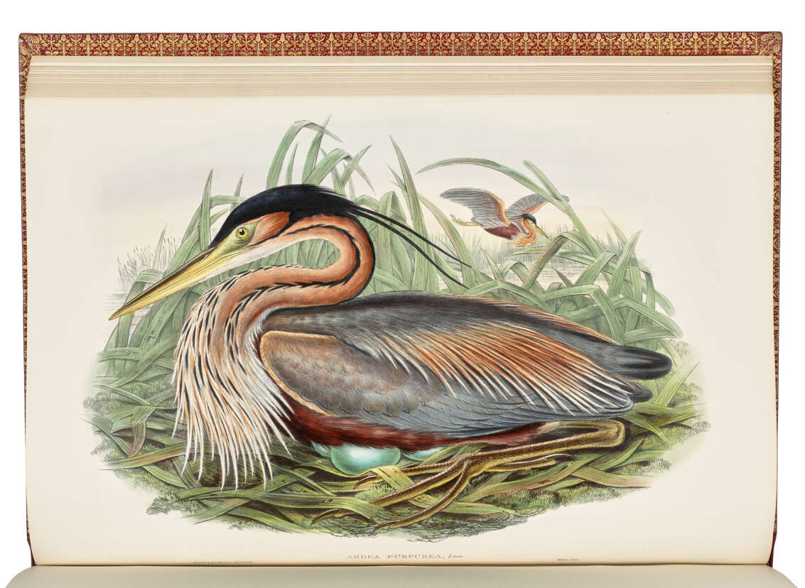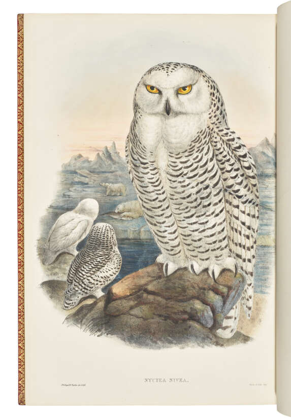 Jeanson’s extremely fine, clean and handsomely-bound set of 'the most sumptuous and costly of British bird books.' Gould was especially proud of this work, and it 'was seen - perhaps partly because its subject was British, as the culmination of [his] ... genius' (Isabella Tree, The Ruling Passion of John Gould, London: 1991, p.207). The text is longer than in any of his other works, and the plates are amongst the finest Gould produced. Joseph Wolf, who drew 57 of the plates, had accompanied Gould on an ornithological tour of Scandinavia in 1856, and was responsible for persuading Gould and H.C. Richter to adopt a livelier treatment of the illustrations.