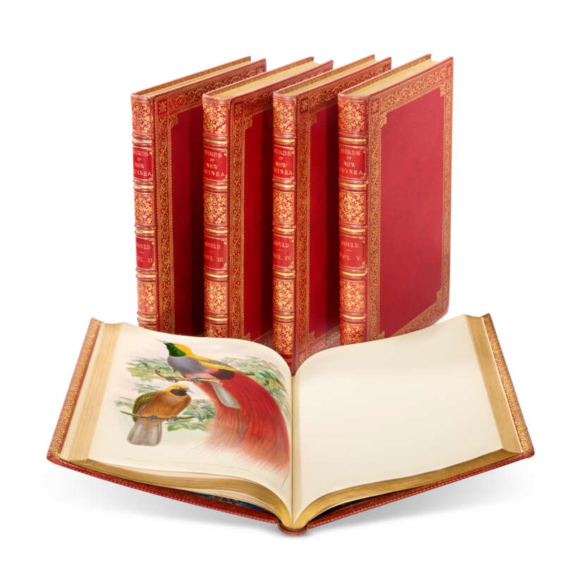 5 volumes, large folio (550 x 370mm). 320 fine hand-coloured lithographic plates by Gould and Hart, printed by Walter or the Mintern Brothers, many heightened with gum-arabic (one or two plates with very faint even browning, otherwise a fine, clean copy). Near-contemporary red morocco [unsigned, but most probably by Zaehnsdorf as it is bound uniformly with the set of The Birds of Great Britain (see lot 90)], covers with wide gilt border composed of a fleur-de-lys and leaf roll used twice, two fillet tramlines and a dotted roll used twice, sandwiching a large ornate foliate roll terminating with foliate cornerpieces, gilt spines with double raised bands in 6 compartments, lettered in second and fourth, the others filled with elaborately-tooled foliate centrepieces, marbled endpapers, gilt edges and inner dentelles (extremities lightly rubbed, small mark at head of front cover to vol. III).
