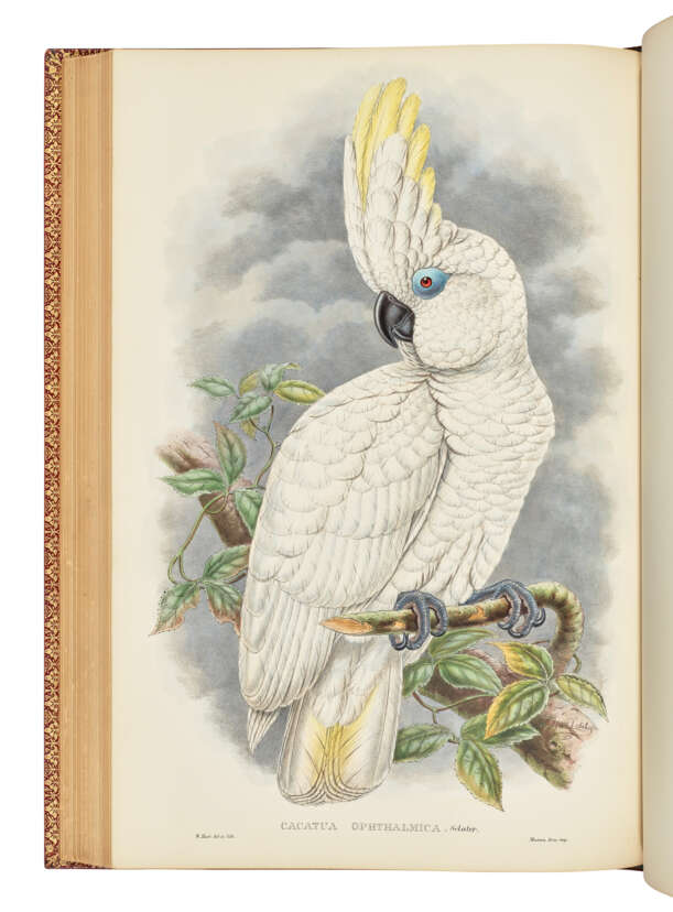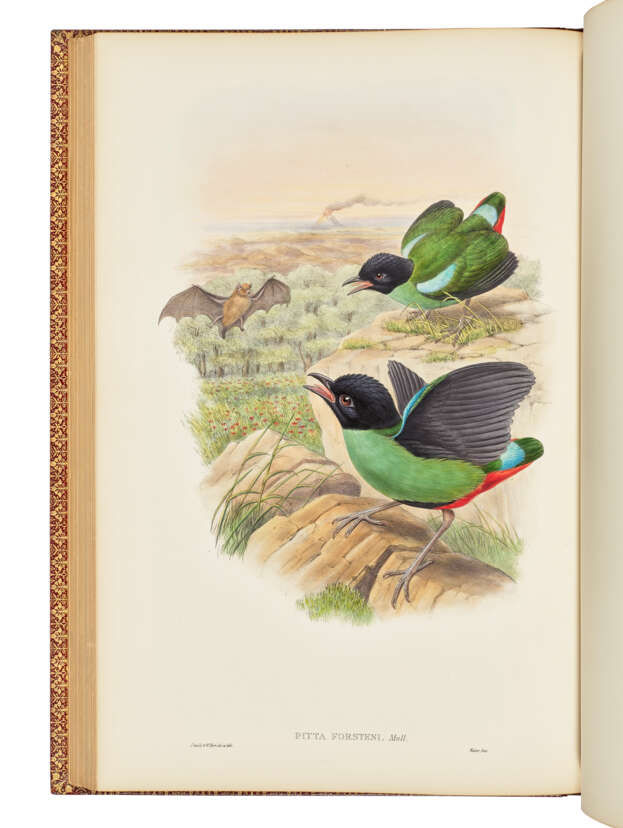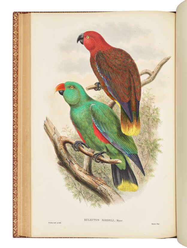 An extremely fine, clean and handsomely bound set of Gould's companion to his monumental Birds of Australia. Gould died on 3 February 1881 shortly after the publication of the 12th part. The remaining 13 parts were edited or written by Sharpe and illustrated by William Matthew Hart. There are many impressive sections with bold depictions often including the birds' natural habitats and food sources such as specific reptiles and insects. Represented bird families include birds-of-paradise, eagles, honey-eaters, sunbirds, thickheads, flowerpeckers, starlings, pittas, kingfishers, cuckoos, parrots, lorikeets, cockatoos, fruit-pigeons, and, in finale, cassowaries. Anker 181; Fine Bird Books (1990) p.102; Nissen IVB 373; Sauer 27; Wood p.365; Zimmer pp.262-263.