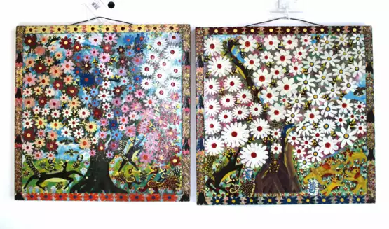 (1924 Altenfelde/ Ostpreußen - 1998). 2 Gemälde mit Landschaften und Tieren. Kunstharzfarbe auf Hartfaser (beidseitig bemalt). 40,5 x 40,5 cm. Im bemalten Holzrahmen.