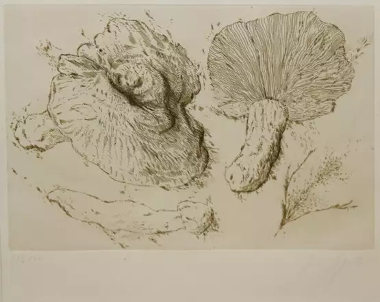 (1927 Danzig - Lübeck 2015). Pilze. Radierung, (19)73. Plgr. 29,5 x 39,5 cm. Unt. re. sign. u. dat. Unt. li. num "57/100". Unt. Passep. u. Gl. ger. - Etw. fl.