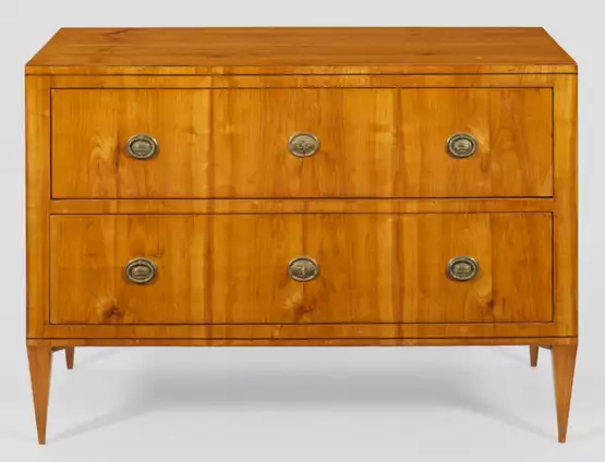 Kirschbaum, furniert. Gerader, querrechteckig angelegter Korpus auf konischen Vierkantbeinen. In der gegliederten Front zwei große Schubladen. Dem Korpus entsprechende Deckplatte. H. 82,5 cm. 116,5 cm x 56,5 cm.