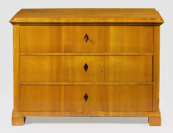 Kirschbaum, furniert. Gerader, querrechteckig angelegter Korpus auf schmaler Zarge und gekanteten Füßen. In der gegliederten Front drei breite Schubladen. Gering überstehende, gestuft ansteigende Deckplatte. H. 78 cm. 111 cm x 50 cm.