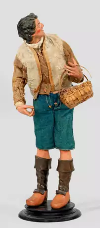 Mann mit gewelltem Haar und ausdrucksstarkem Gesicht in schlichter, ländlicher Tracht, einen Korb mit Holzscheiten tragend. Terrakotta farbig gefasst, Glasaugen, Stoff, Weide, Holz. Runder, ebonisierter Holzsockel, neuzeitlich. Ges.-H. 40,5 cm. Minim. Alters- und Gebrauchsspuren.