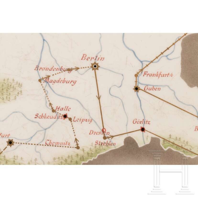Porzellan, farbig gefasst, glasiert. Deutschlandkarte des Jahres 1935 mit in Grüntönen dargestellten Gebirgszügen, in unterschiedlichen goldenen Linien gezeichneten Routen der sechs Wertungstage sowie in Rot beschrifteten Namen der Städte und Stationen. Außerdem in Rot/Gold eingezeichnet die verschiedenen Landeplätze, Zielabwurfsstationen oder Übernachtungs-Flughäfen sowie eine entsprechende Legende am rechten Rand. Rechts unten blaue Zepter- und rote Reichsapfelmarke der KPM, darüber das DLV-Emblem in Silber, Schwarz und Rot mit goldener Inschrift "Ehrenpreis Deutschlandflug 1935 - Der Reichsverband der deutschen Luftfahrt-Industrie". Glatter Silberrahmen mit appliziertem Eichenlaub- bzw. Lorbeerdekor in den vier Ecken, am Unterrand deutsche Feingehaltspunze für 835er Silber mit Zusatz "RRT". Die Rückseite des Silberrahmens mit schwarz gefasster Holzauskleidung. Maße 52,5 x 64,5 cm.