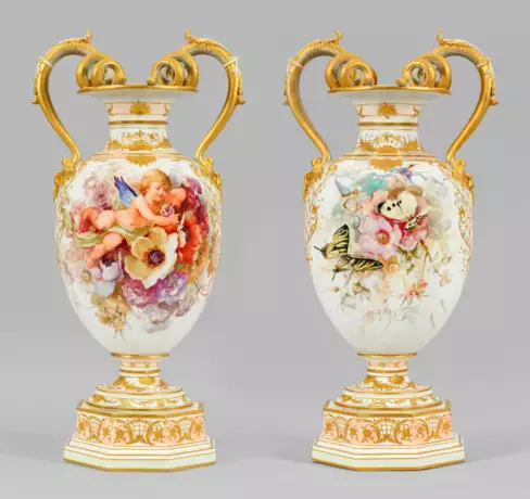 Über oktogonalem, getrepptem Postament mit rundem Fuß, ovoider Korpus mit gerundeter Schulter, in eingezogenen Hals und weit ausschwingenden Rand übergehend. Seitlich, über aufgelegtem Blattreliefansatz geschweift aufsteigende, reich vergoldete Handhaben in Gestalt eines, sich spiralförmig windenden Schlangenpaares. Schauseitig der Wandung großflächiges Arrangement mit Anemonen und in diesem Blütenmeer sich wonnender Amor mit Zweig. Rücks. weit verzweigende Heckenrosen mit einem Schwarm von Schmetterlingen. Virtuose, teilw. weißgehöhte, sog. Weichmalerei in farbenprächtiger, diffus verlaufender polychromer Malerei. Auf dem Fuß, seitlich der Henkel sowie auf Schulter und Hals feingliedrige, florale- und ornamentale Reliefgoldbordüren auf teilw. mintgrünem bzw. lachsfarbenem Fond. Form-Entw. Julius Wilhelm Mantel, 1855. Minim. rest.; Äußerst minim. best.; Zepter-, Adler- und Malereimarke. H. 48 cm.