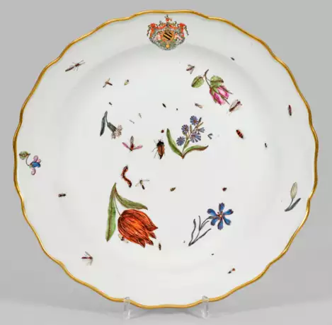 Runde, leicht vertiefte Form mit passig geschweiftem Rand. Im Spiegel und auf der Fahne große ombrierte Holzschnittblumen umgeben von Käfern, Raupen und weiteren Insekten. Auf Steigbord und Fahne farbiges Wappen von Carlo Francesco Vincenzo Ferrero Marchese d'Ormea (1680 - 1745), Großkanzler des Königreichs von Sardinien unter Karl Emanuel I., König von Sardinien-Piemont und als Karl Emanuel III. Herzog von Savoyen. Polychrome Malerei mit Goldstaffage. Prägeziffer 21. Rest.; Schwertermarke. D. 43 cm.