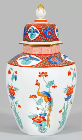 Balusterförmiger, sechsfach facettierter Korpus mit konisch eingezogener Schulter und kurzem Hals. Korrespondierender, überkragender Haubendeckel mit spitzem Knauf. Auf der Wandung alternierend Mandeleibisch- und Päonienstaude mit teilw. darauf sitzendem Hôô-Vogel. Schulter und Deckel mit ausgesparten Reserven und darin fliegenden Tauben sowie Gittermuster auf rotem Grund mit Lotusblüten. Feine polychrome Malerei mit Goldrand. Schwertermarke. H. 46 cm.
