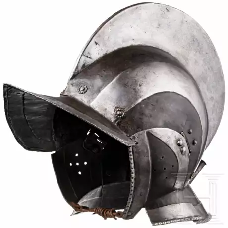 Schwere, zweiteilig gearbeitete Kalotte mit hohem, geschnürtem Kamm und einteilig geschmiedetem Augen- und Nackenschirm. Seitlich erhaben getriebene Zierstreifen, umlaufende Futternieten mit Zierrosetten aus Messing. Im Nacken vernietete, eiserne Federbuschtülle. Großer, spitz zulaufender Augenschirm mit gebördeltem und gekerbtem Rand. Nahe der Spitze alte, genietete Reparatur. Im Scharnier anhängende Wangenklappen mit je fünf Gehörlochungen. Höhe 31,5 cm.