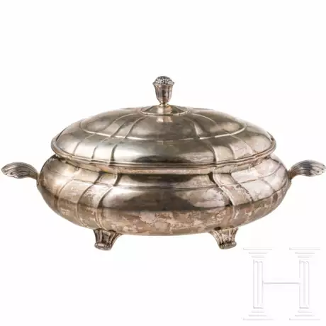 Auf vier Füßen. Der ovale Korpus ist in geschwungenen Zügen gegliedert. Leicht gewölbter Steckdeckel entsprechend gestaltet. Plastischer Blütenknauf. Seitlich zwei Muschelhandhaben. Unterseite in Gravur "Laurits Laursen", "Kalk- og Teglvaerksforeningen af 1893 1912 - 25 Januar 1937". Punziert mit Stadtmarke Kopenhagen "37", Beschauzeichen Johannes Siggaard, "925" sowie "CHR.K.OVESEN". Länge 49 cm, Gewicht 2814 g.
