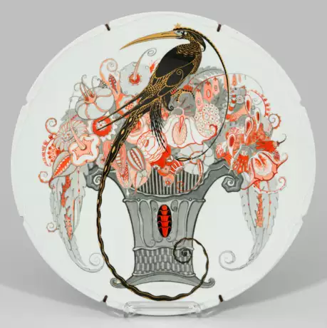 Runde, leicht gemuldete Form mit kleinen, den Rand rhythmisierenden Einbuchtungen sowie linienförmiger, geschwungener Reliefkontur. Im Spiegel expressive, flächendeckende Darstellung eines kraterförmigen, ornamental gestalteten, in Voluten endenden Vase mit üppig arrangierten Blütengewächsen. Zentral darauf sitzender Paradiesvogel mit weit ausgebreitetem Gefieder. Feine polychrome Malerei mit Goldstaffage. Entw. Willi Münch-Khe, um 1912. Beschliffene Malersign "Willi Münch Khe". Wandaufhängung. Schwertermarke. D. 45 cm.