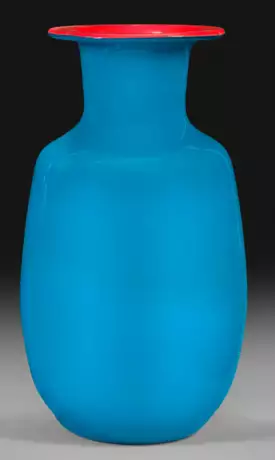 Petrolblaues Glas mit rotem Unterfang. Altes "made in Italy"-Etikett. H. 28 cm.