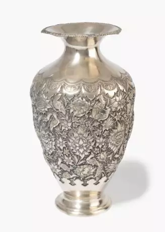 Persien, 20 Jh. Silber. Elegante Balusterform mit getrepptem Fuss. Korpus rundum in Triebarbeit dekoriert mit Darstellung exotischer Vögel, Löwenköpfen und Blumen. Unter dem Fuss zwei unleserliche Punzen sowie Punze '84' (Reinheitsgehalt). H 34,5 cm. Gewicht 1378 g.