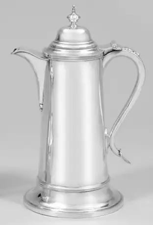 Sterlingsilber. Auf rundem, ausgestelltem Fuß konischer Korpus mit rücks. Henkel, hoch ansetzendem Konsolausguss und aufgewölbtem Scharnierdeckel mit Knauf. Minim. rest.; Gest. Beschaumarken, Herstellerzeichen, Jahresbuchstabe "A". Gew. zus. ca. 1060 g. H. 32 cm.