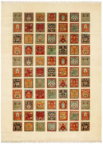 Afghanistan. Wolle auf Baumwolle. Auf cremefarbenem, abraschierten Fond flächendeckende Musterung aus unterschiedlich gestalteten Feldern mit Nischenmotiven, Blütenzweigen und Palmetten. 343 cm x 252 cm.